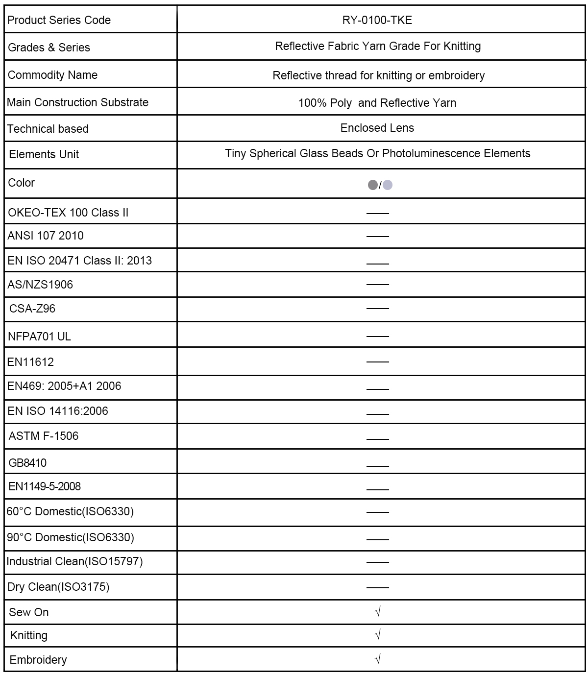 Aeon-VizTM Reflective Fabric Yarn Grade RY-0100-TKE series Embedded semi-enclosed glass beads type 100% polyester reflective thread designed for enhancing visibility in low light and nighttime conditions, it is a highly reflective product and can match with different base materials. Extremely bright and durable, it is easily incorporated into a design and creates a point of difference. It is washable and gives a retro-reflective effect, to improve the wearer is available at night or in adverse environments sight visibility plays a significant role.