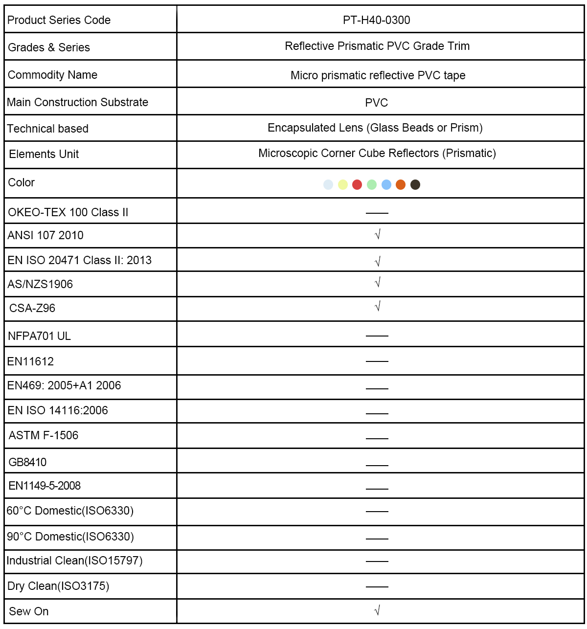 Aeon-VizTM Reflective Prismatic PVC Grade PT-H40-0300 series Embedded prism type reflective PVC trim designed for enhancing visibility in low light and nighttime conditions, bonded to a PVC substrate composed with wide-angle and high-refractive index retro-reflective lens structure, to improve the wearer is available at night or in adverse environments sight visibility plays a significant role.