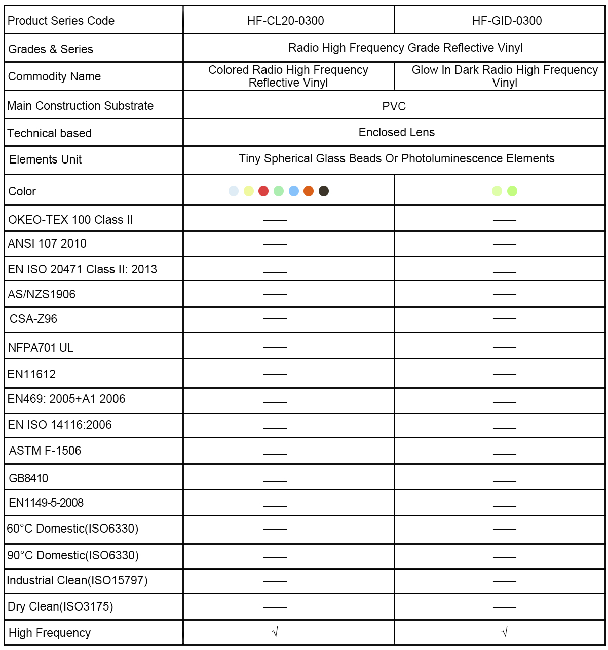 Aeon-VizTM Radio High Frequency Grade HF-0300 series Embedded glass beads type reflective vinyl designed for enhancing visibility in low light and nighttime conditions, bonded to a PVC substrate composed with wide-angle and high-refractive index retro-reflective lens of glass beads exposed structure, to improve the wearer is available at night or in adverse environments sight visibility plays a significant role.